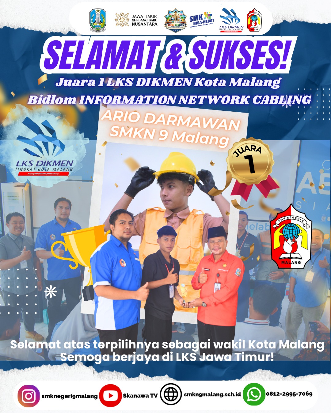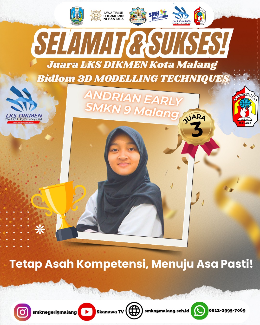 Selamat dan Sukses! Keluarga besar SMKN 9 Malang mengucapkan selamat dan apresiasi atas diraihnya 🏆 Juara 3 LKS DIKMEN Kot...