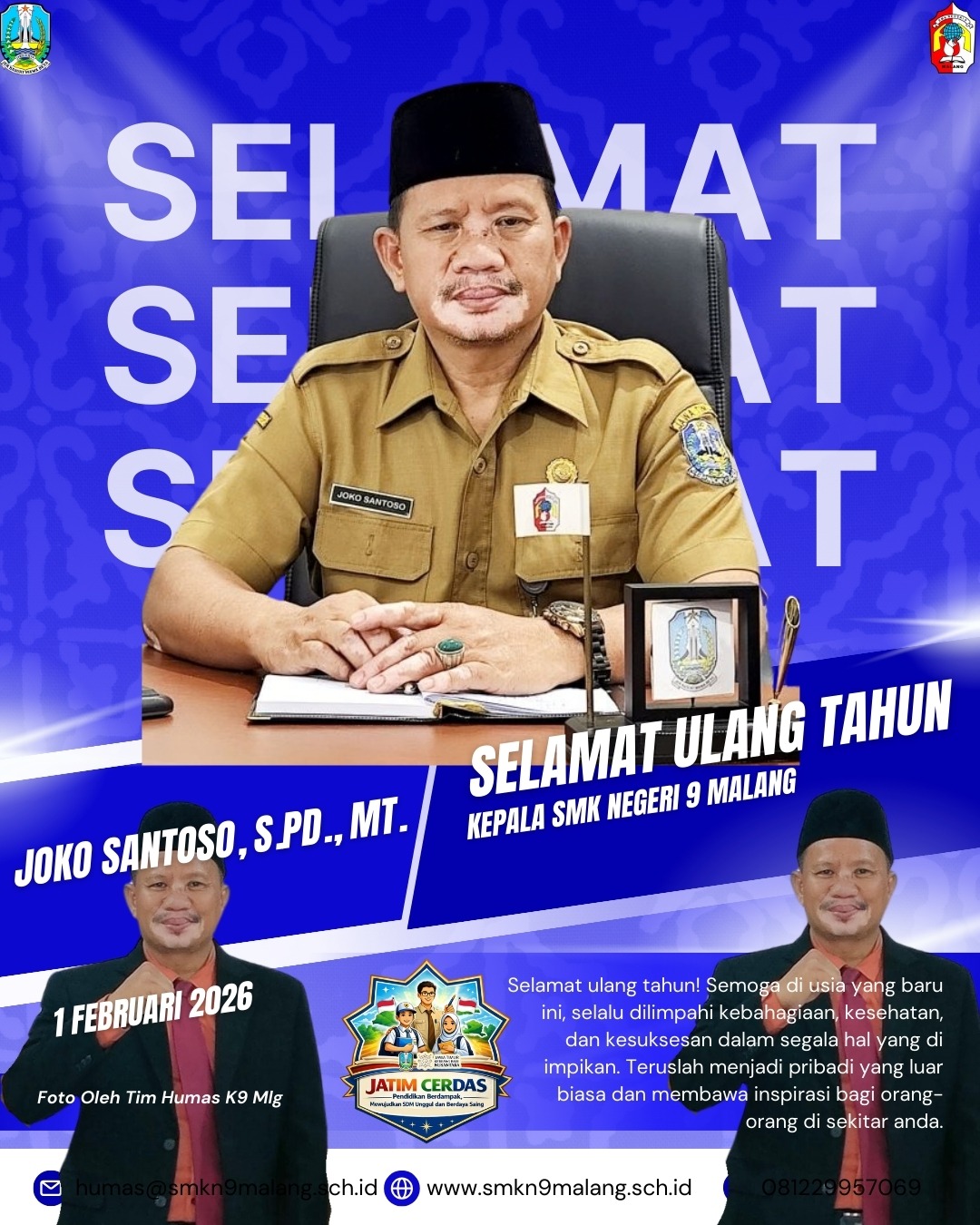 Keluarga besar SMKN 9 Malang mengucapkan: Selamat Ulang TahunkepadaBapak Joko Santoso, S.Pd., M.TKepala SMKN 9 Malang Semo...