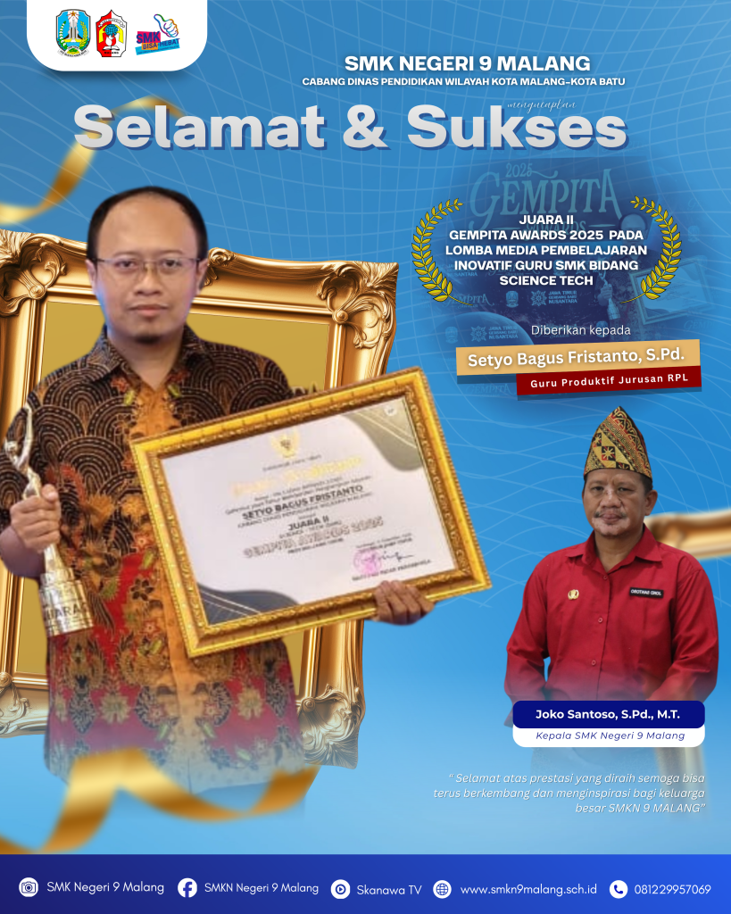 Segenap keluarga besar SMKN 9 MALANG dengan bangga mengucapkan SELAMAT DAN SUKSES kepada Bapak Setyo Bagus Fristanto, S.Pd., Guru Produktif Jurusan Rekayasa Perangkat Lunak (RPL). Kami sangat mengapresiasi dan bangga atas pencapaian luar biasa beliau yang berhasil meraih JUARA II dalam ajang GEMPITA AWARDS 2025 pada Lomba Media Pembelajaran Inovatif Guru SMK Bidang Science Tech. […]