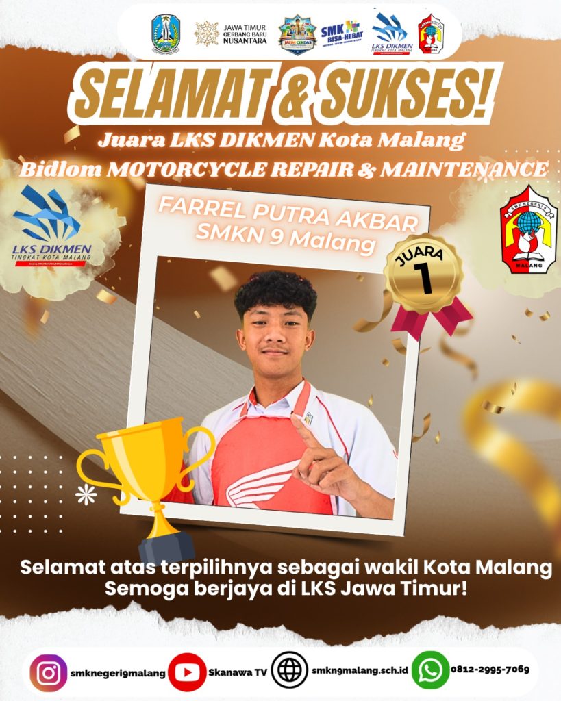 Selamat dan Sukses! Keluarga besar SMKN 9 Malang sekali lagi turut bangga dan mengucapkan selamat serta apresiasi setinggi-tingginya atas pencapaian Juara 1 LKS DIKMEN Kota Malang Bidang Lomba Motorcycle Repair and Maintenance yang diwakili oleh Farel Putra Akbar dengan Guru Pembimbing Bapak Ahmad Arip. Prestasi ini merupakan hasil dari kerja keras, ketekunan, dan kompetensi unggul […]