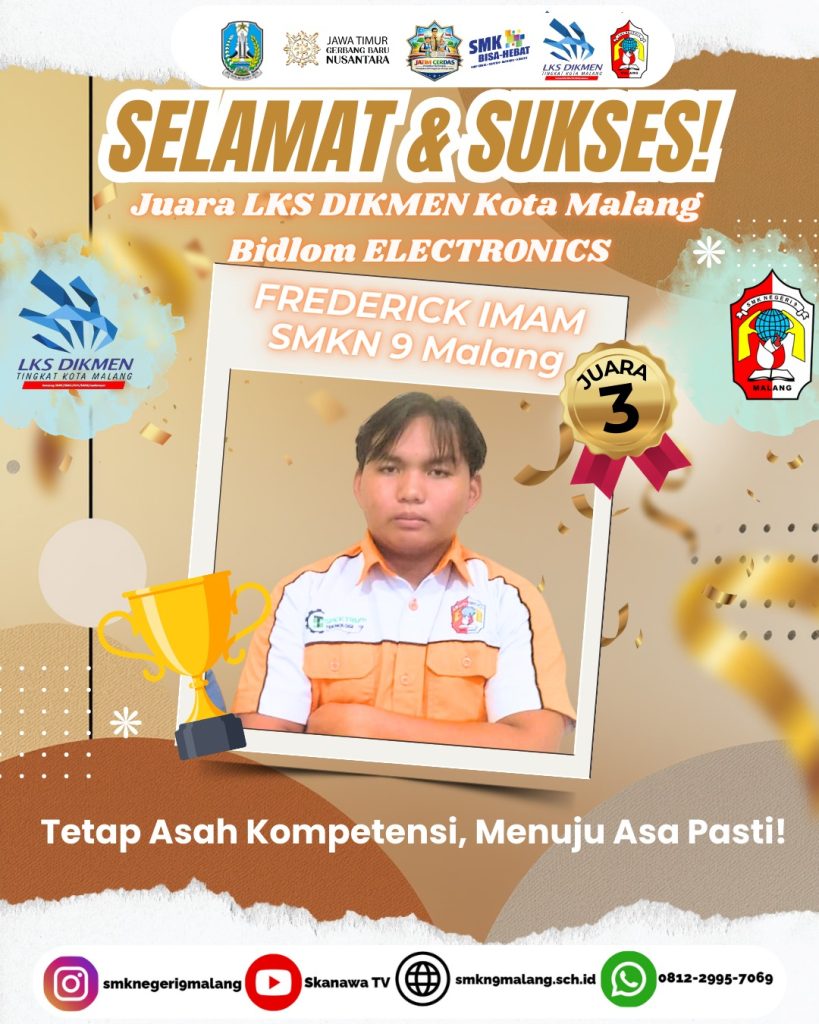 Selamat dan Sukses! Keluarga besar SMKN 9 Malang mengucapkan selamat dan apresiasi atas diraihnya 🏆 Juara 3 LKS DIKMEN Kota Malang Bidang Lomba Electronics oleh ananda Frederick Imam dengan Guru Pembimbing Bapak Tri Sukowibowo. Prestasi ini merupakan bukti kompetensi, kerja keras, dan semangat berprestasi dalam bidang elektronika. Semoga pencapaian ini menjadi motivasi untuk terus meningkatkan […]