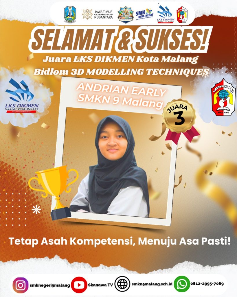 Selamat dan Sukses! Keluarga besar SMKN 9 Malang mengucapkan selamat dan apresiasi atas pencapaian 🏆 Juara 3 LKS DIKMEN Kota Malang Bidang Lomba 3D Modelling Techniques yang diwakili oleh Andrian Early dengan Guru Pembimbing Bapak Devaga Betayoka. Prestasi ini merupakan wujud kreativitas, ketekunan, dan kompetensi dalam bidang pemodelan 3D. Semoga capaian ini menjadi motivasi untuk […]