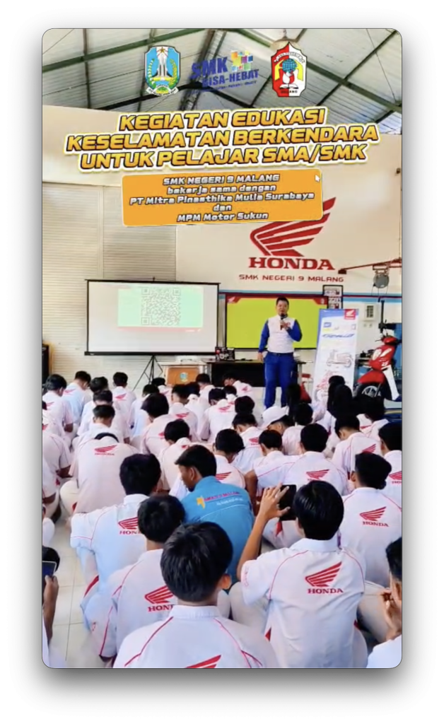 SMKN 9 Malang kembali menyelenggarakan kegiatan edukatif bagi peserta didik melalui sosialisasi keselamatan berkendara bagi siswa SMA/SMK. Kegiatan ini dilaksanakan bekerja sama dengan PT Mitra Pinastika Mulia Surabaya dan MPM Motor Sukun, serta diikuti oleh siswa dari kompetensi keahlian Teknik Sepeda Motor (TSM). Kegiatan ini bertujuan untuk meningkatkan kesadaran dan pemahaman siswa tentang pentingnya keselamatan […]
