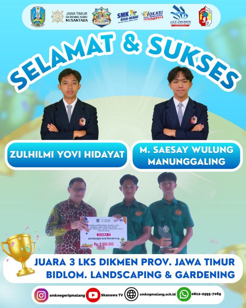 Selamat kepada peserta didik yang telah berhasil meraih Juara 3 LKS Dikmen pada bidang lomba Landscaping and Gardening. Pencapaian ini merupakan hasil dari kerja keras, kreativitas, serta dedikasi yang luar biasa.